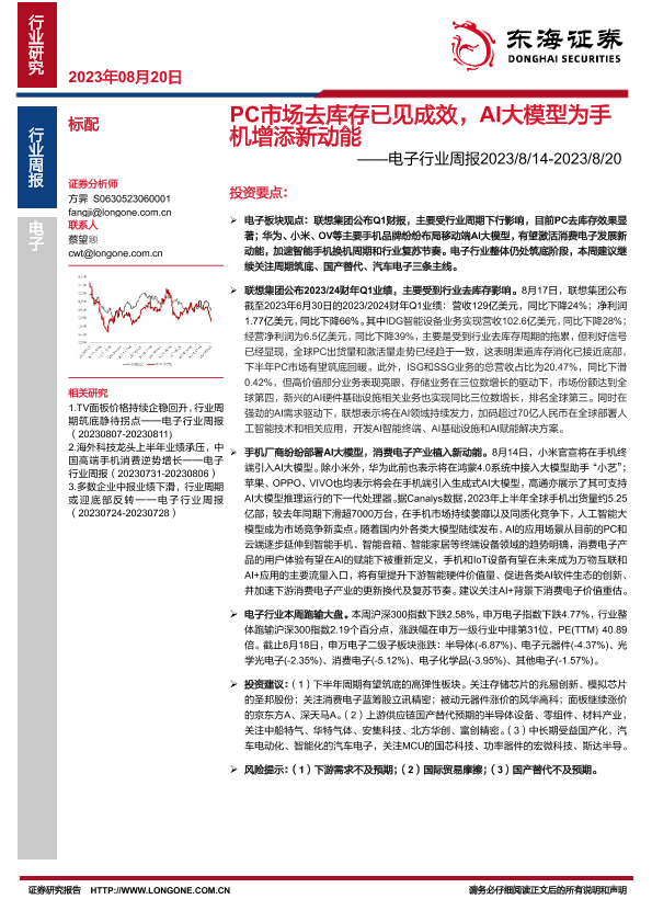 【东海证券】【20230820】20230820-东海证券-电子行业周报:PC市场去库存已见成效,AI大模型为手机增添新动能-18页