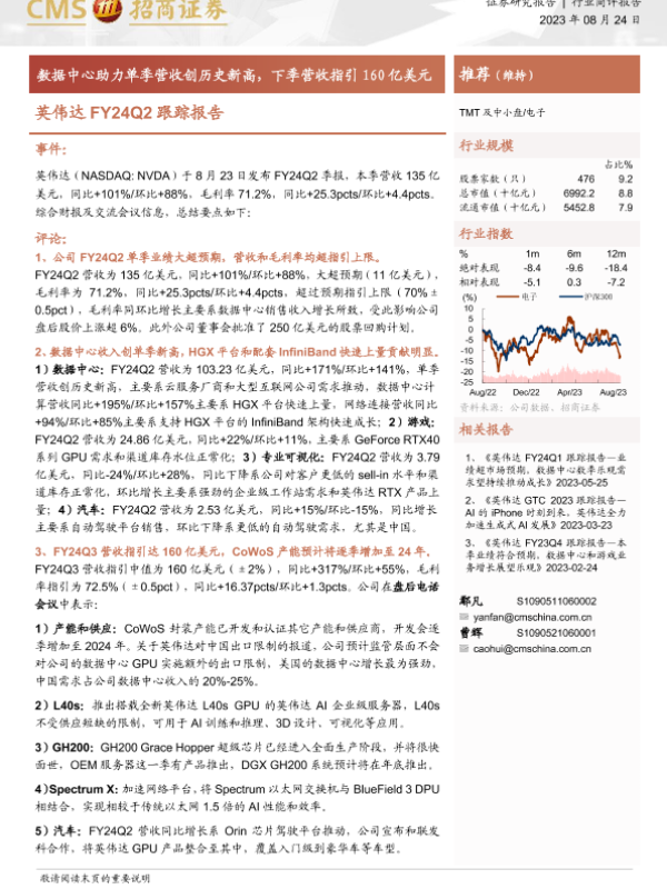 【海通证券】【20230824】英伟达FY24Q2跟踪报告-数据中心助力单季营收创历史新高,下季营收指引160亿美元-14页
