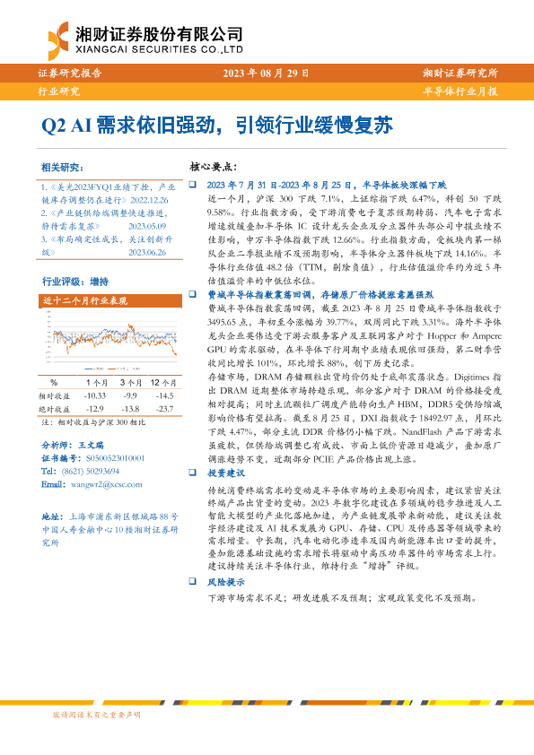 【湘财证券】【20230829】20230829-湘财证券-半导体行业月报:Q2AI需求依旧强劲,引领行业缓慢复苏-11页
