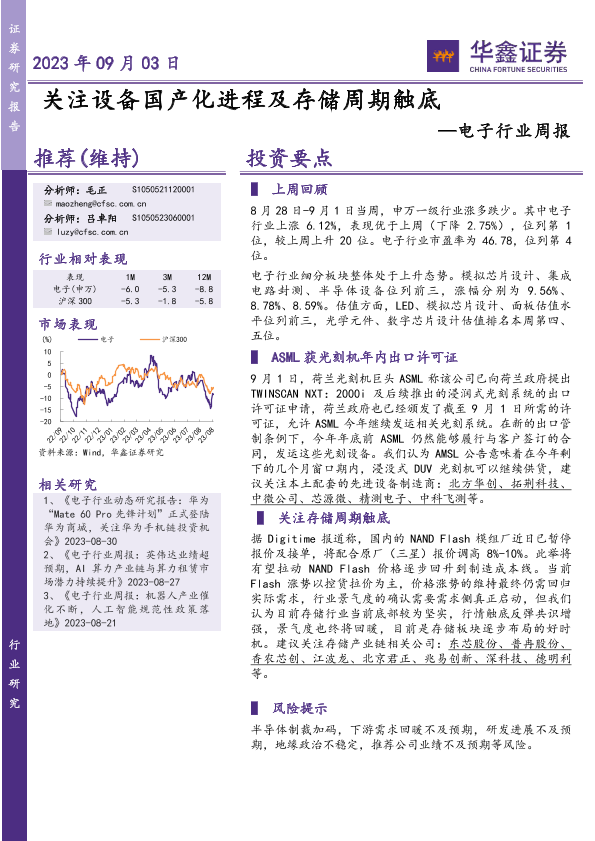 【华鑫证券】【20230903】20230903-华鑫证券-电子行业周报:关注设备国产化进程及存储周期触底-41页