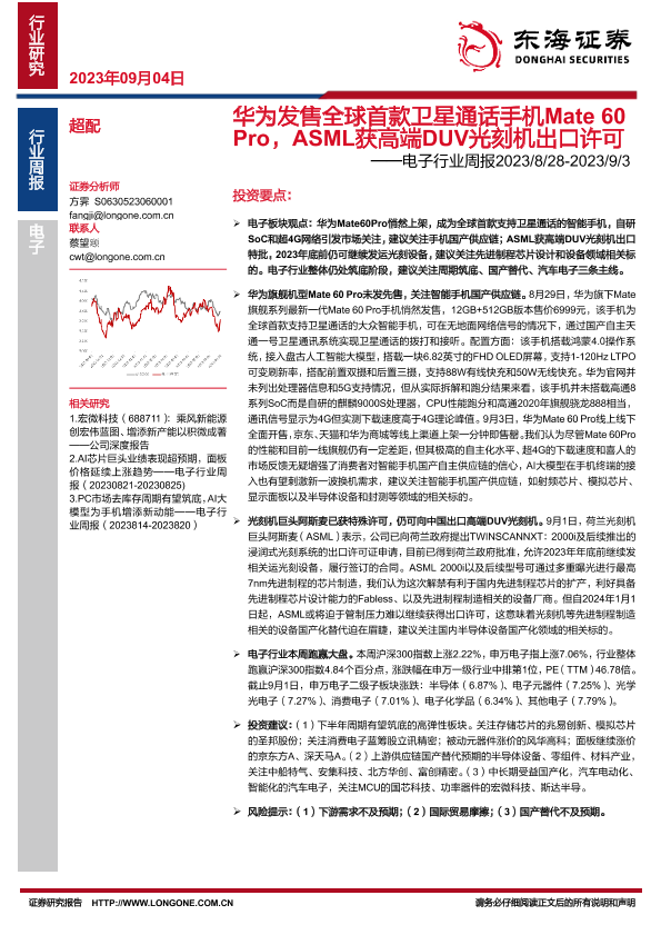 【东海证券】【20230904】电子行业周报:华为发售全球首款卫星通话手机Mate 60Pro,ASML获高端DUV光刻机出口许可-26页
