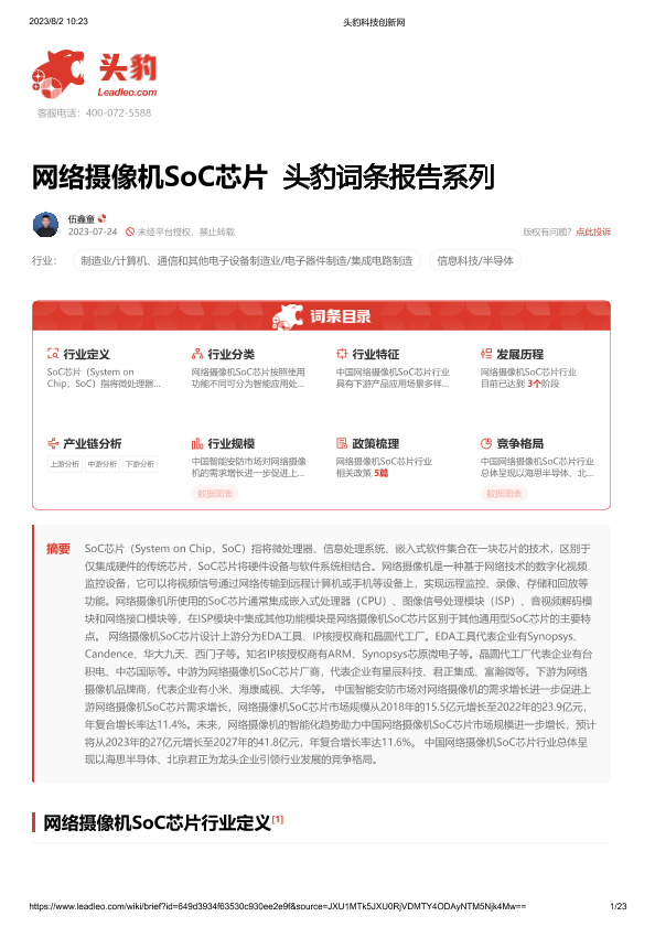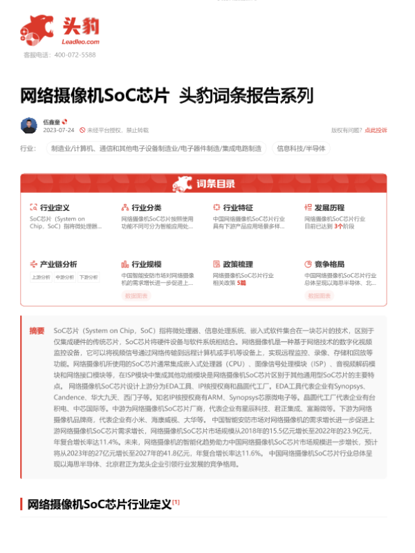 【头豹研究院】【20230724】网络摄像机SoC芯片 头豹词条报告系列-23页