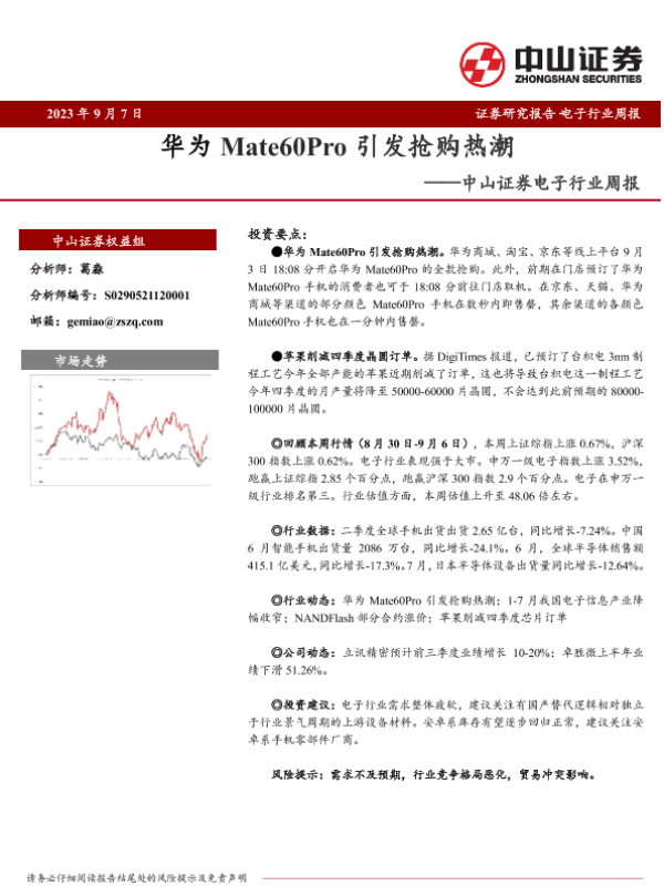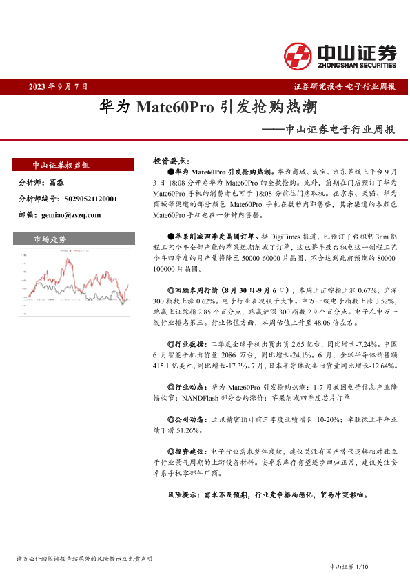 【中山证券】【20230907】20230907-中山证券-电子行业周报:华为Mate60Pro引发抢购热潮-10页