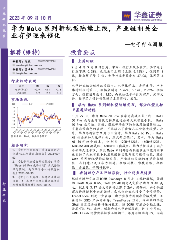 半导体 华为Mate系列 卫星通话 存储产品涨价 电子行业