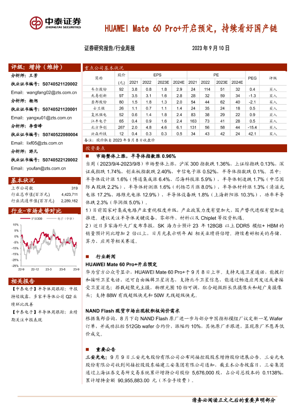 【中泰证券】【20230910】20230910-中泰证券-半导体行业周报:HUAWEI Mate 60 Pro+开启预定,持续看好国产链-12页