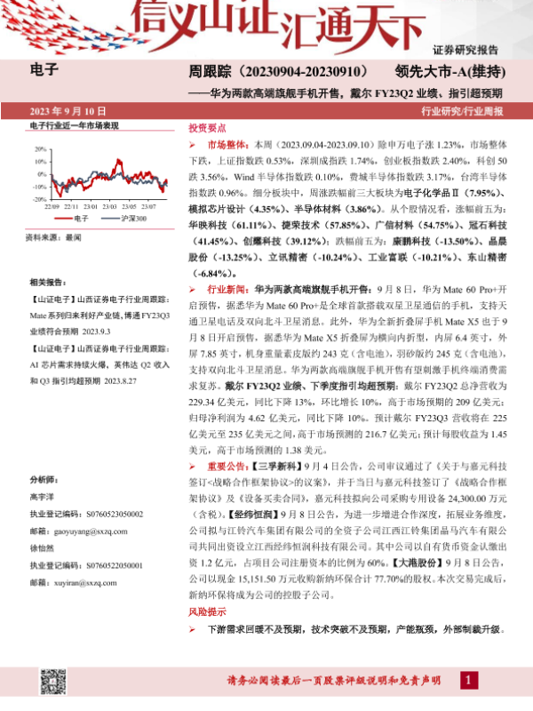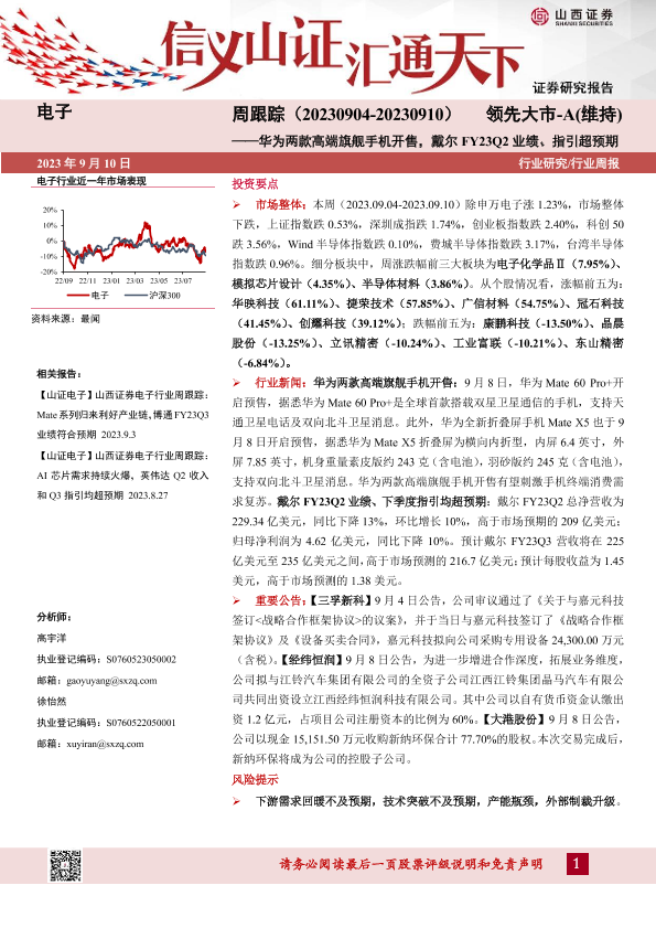 【山西证券】【20230910】20230910-山西证券-电子周跟踪:华为两款高端旗舰手机开售,戴尔FY23Q2业绩、指引超预期-17页