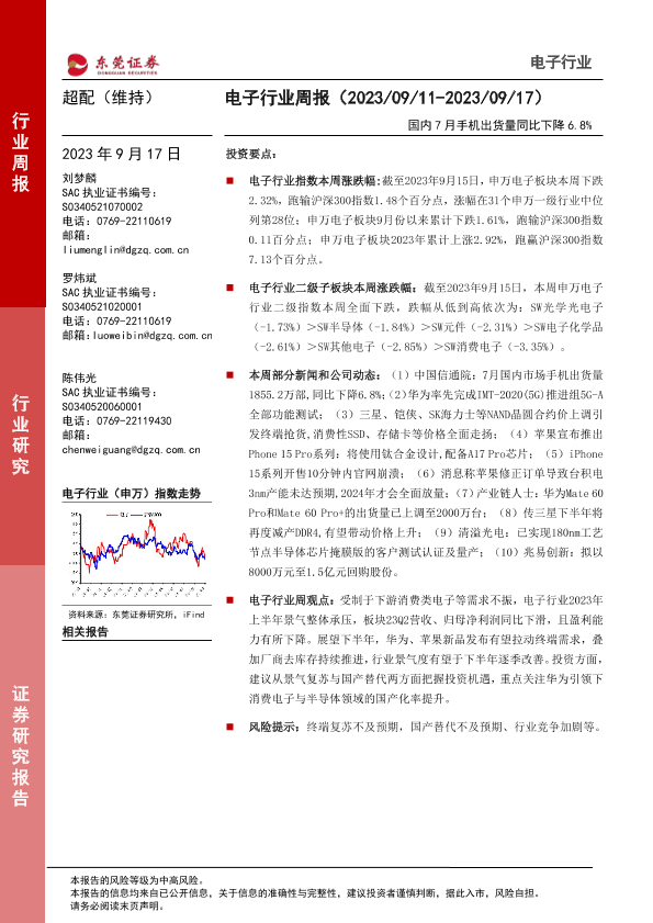 【东莞证券】【20230917】20230917-东莞证券-电子行业周报:国内7月手机出货量同比下降6.8%-11页