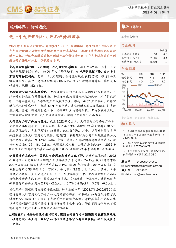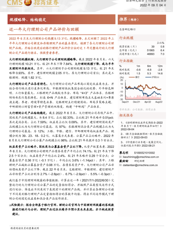 【海通证券】【20220904】银行业深度报告:近一年大行理财公司产品评价与回顾,规模略降、结构稳定-20页