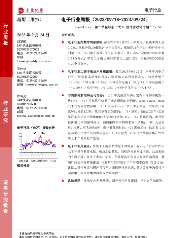 【东莞证券】【20230924】20230924-东莞证券-电子行业周报:TrendForce:第二季全球前十大IC设计营收环比增长12.5%-11页