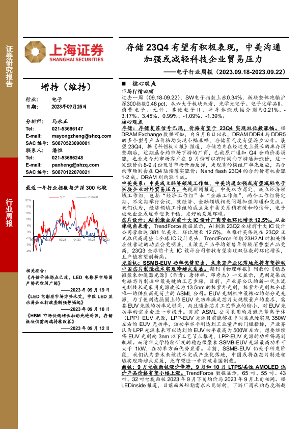 【上海证券】【20230925】电子行业周报:存储23Q4有望有积极表现,中美沟通加强或减轻科技企业贸易压力-13页