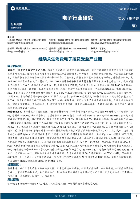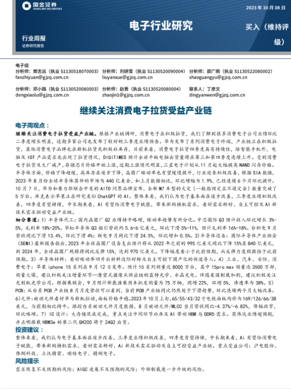【国金证券】【20231008】20231008-国金证券-电子行业研究:继续关注消费电子拉货受益产业链-13页
