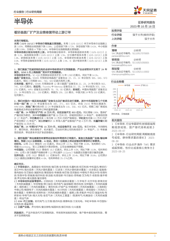【天风证券】【20231016】20231016-天风证券-半导体行业研究周报:看好晶圆厂扩产及业绩修复带动上游订单-15页