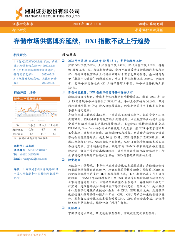 【湘财证券】【20231017】20231017-湘财证券-半导体行业双周报:存储市场供需博弈延续,DXI指数不改上行趋势-10页