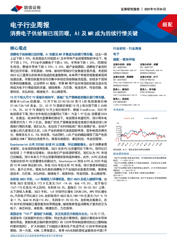【国信证券】【20231024】20231024-国信证券-电子行业周报:消费电子供给侧已现回暖,AI及MR成为后续行情关键-13页