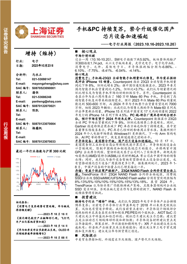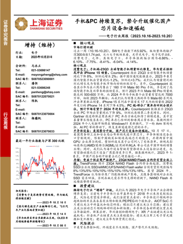 【上海证券】【20231023】电子行业周报:手机&PC持续复苏,禁令升级催化国产芯片设备加速崛起-12页