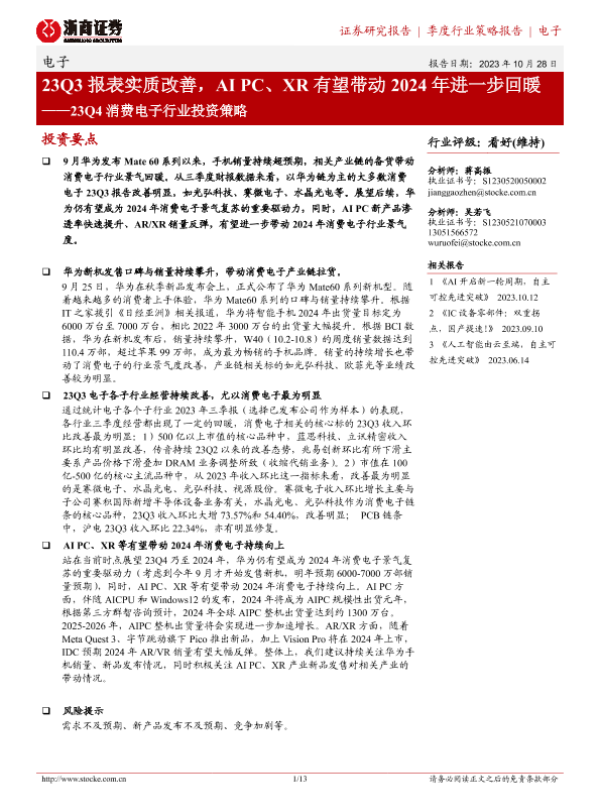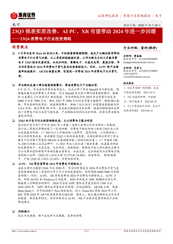【浙商证券】【20231028】23Q4消费电子行业投资策略:23Q3报表实质改善,AI PC、XR有望带动2024年进一步回暖-13页