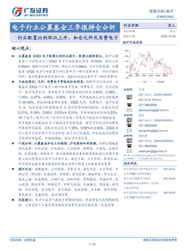 【广发证券】【20231029】电子行业公募基金三季报持仓分析:行业配置比例环比上升,加仓元件及消费电子-24页