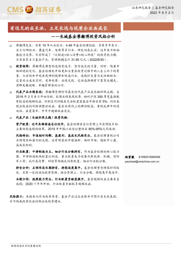 【海通证券】【20220902】长城基金廖瀚博投资风格分析:有远见的成长派,立足长远与优质企业共成长-17页