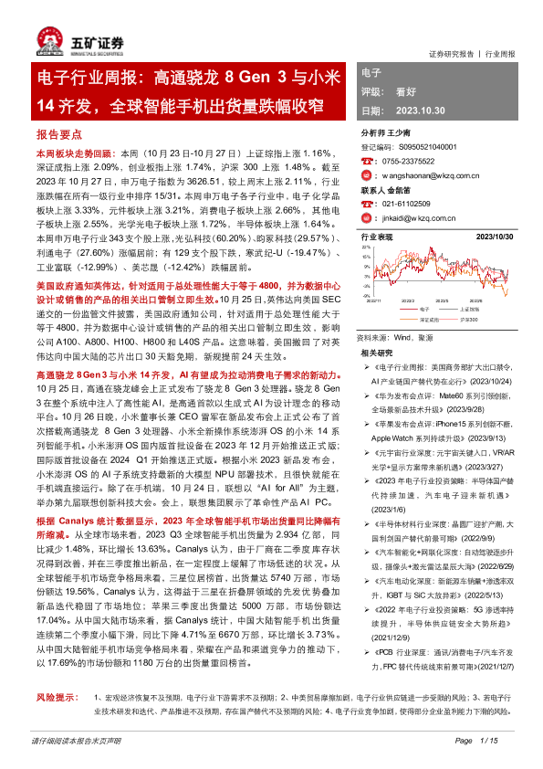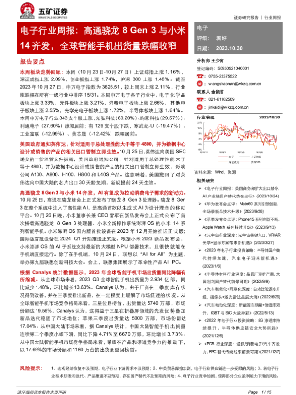 【五矿证券】【20231030】电子行业周报:高通骁龙8 Gen 3与小米14齐发,全球智能手机出货量跌幅收窄-15页