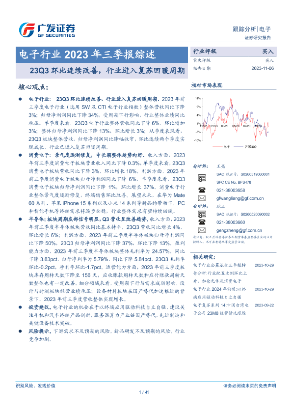 【广发证券】【20231106】电子行业2023年三季报综述:23Q3环比连续改善,行业进入复苏回暖周期-41页