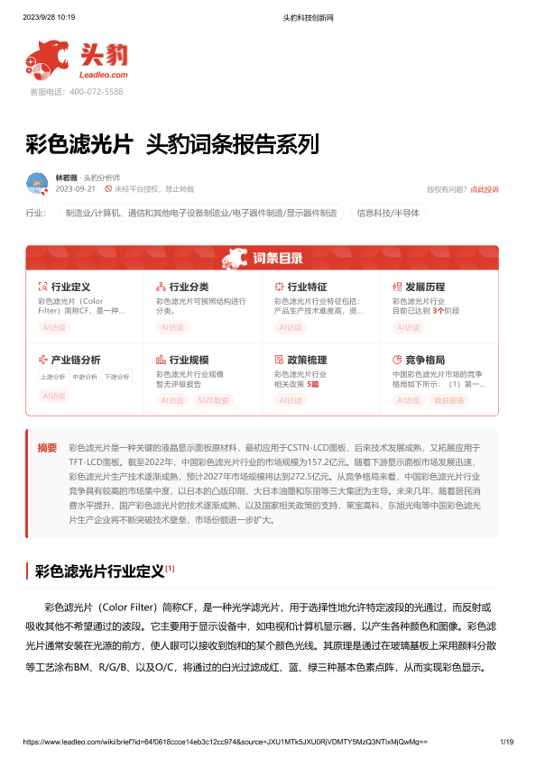 【头豹研究院】【20230921】彩色滤光片 头豹词条报告系列-19页