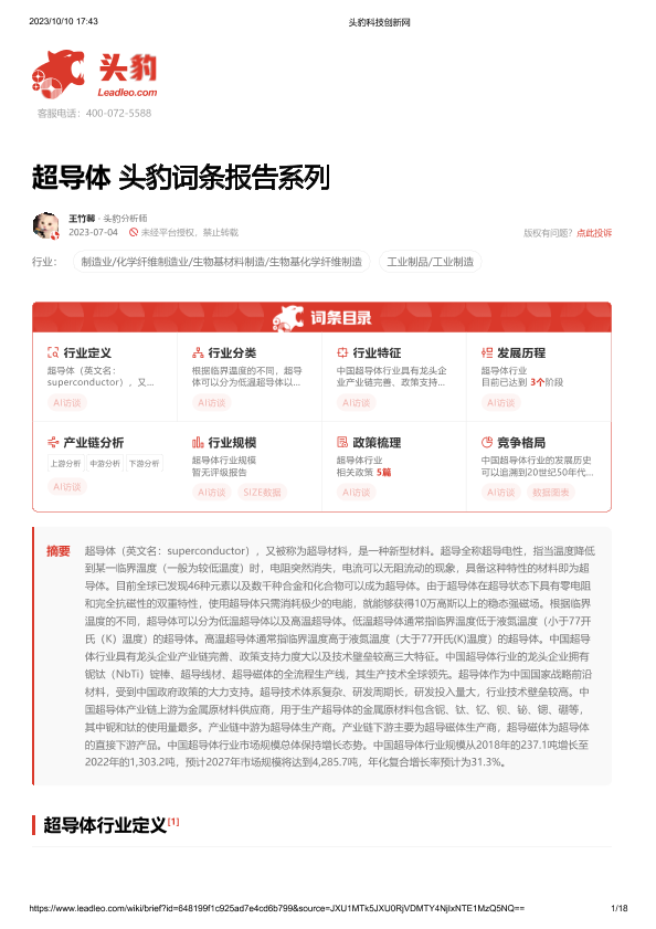 【头豹研究院】【20231010】超导体 头豹词条报告系列-18页