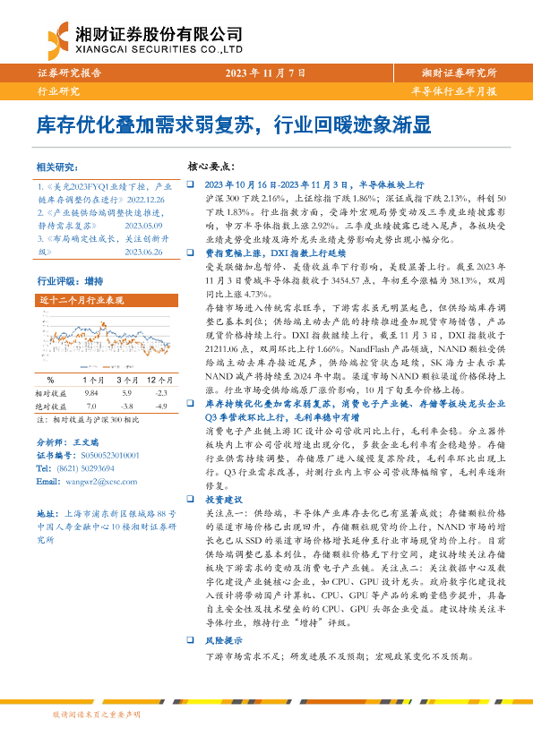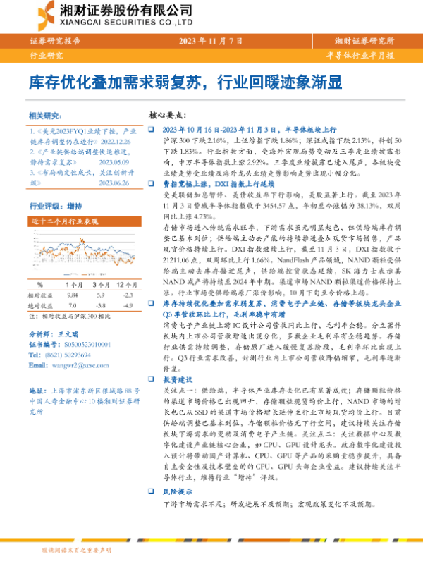 【湘财证券】【20231107】20231107-湘财证券-半导体行业半月报:库存优化叠加需求弱复苏,行业回暖迹象渐显-17页
