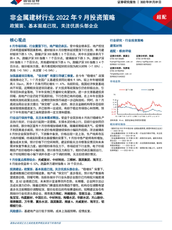 【国信证券】【20220909】非金属建材行业2022年9月投资策略:政策面、基本面底已现,关注优质头部企业-31页