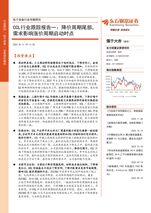 【东方财富证券】【20231113】电子设备行业专题研究:CCL行业跟踪报告一:降价周期尾部,需求影响涨价周期启动时点-19页