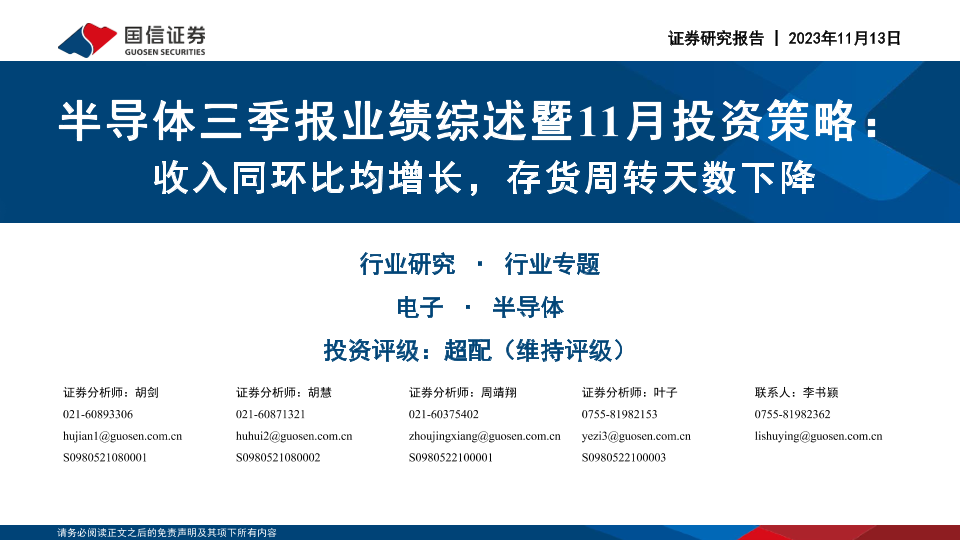 【国信证券】【20231113】20231113-国信证券-半导体三季报业绩综述暨11月投资策略:收入同环比均增长,存货周转天数下降-29页
