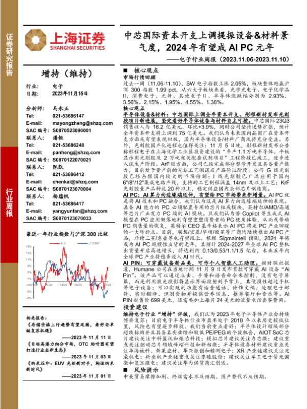 【上海证券】【20231115】电子行业周报:中芯国际资本开支上调提振设备&材料景气度,2024年有望成AIPC元年-12页