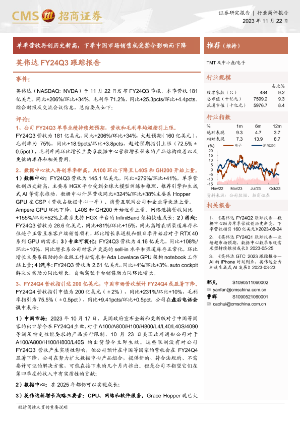 【海通证券】【20231122】英伟达FY24Q3跟踪报告-单季营收再创历史新高,下季中国市场销售或受禁令影响而下降-14页
