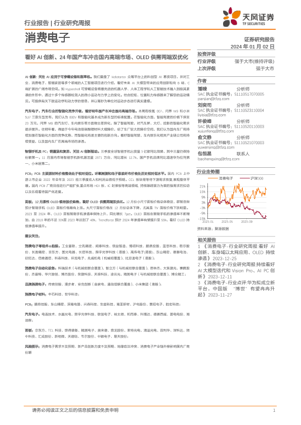 【天风证券】【20240102】消费电子行业研究周报:看好AI创新、24年国产车冲击国内高端市场、OLED供需两端双优化-26页