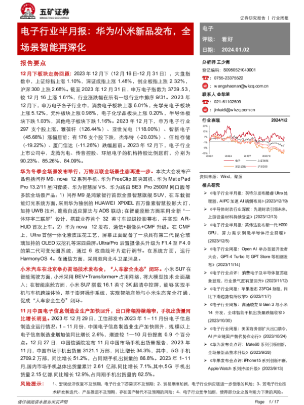 【五矿证券】【20240102】电子行业半月报:华为 小米新品发布,全场景智能再深化-17页