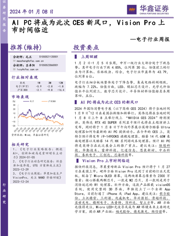 【华鑫证券】【20240108】20240108-华鑫证券-电子行业周报:AI PC将成为此次CES新风口,Vision Pro上市时间临近-48页
