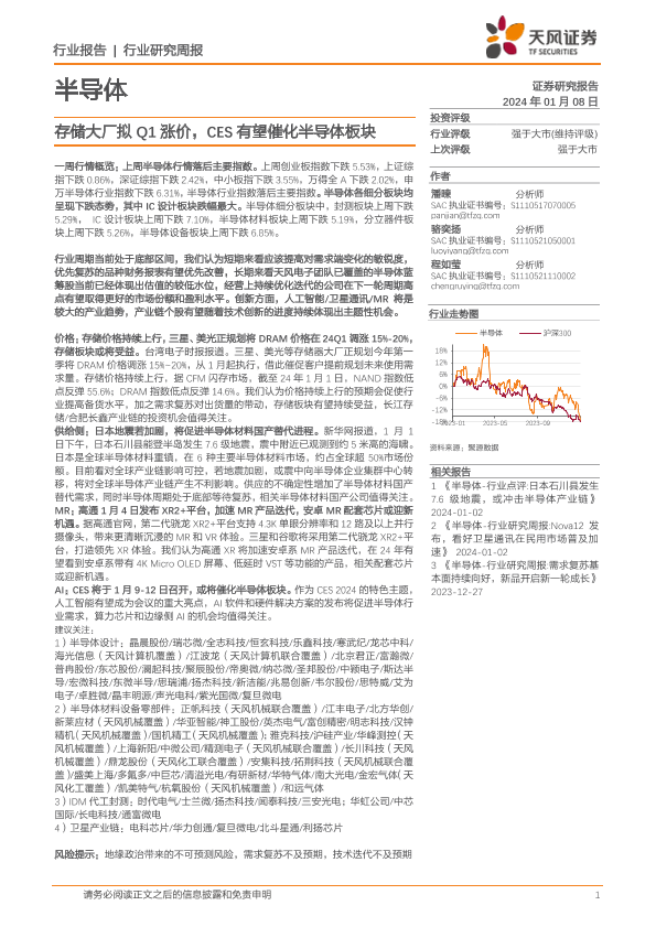 【天风证券】【20240108】20240108-天风证券-半导体行业研究周报:存储大厂拟Q1涨价,CES有望催化半导体板块-35页