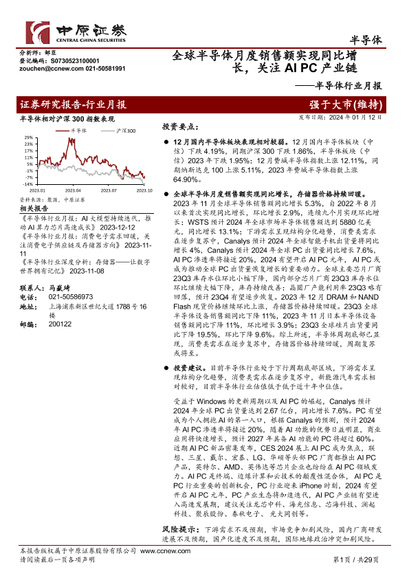【中原证券】【20240112】20240112-中原证券-半导体行业月报:全球半导体月度销售额实现同比增长,关注AI PC产业链-29页