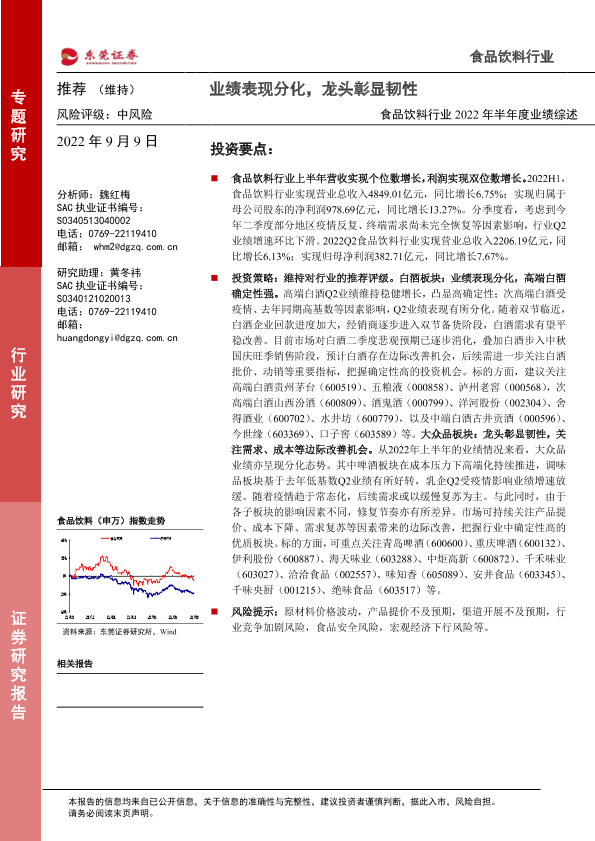 【东莞证券】【20220909】食品饮料行业2022年半年度业绩综述:业绩表现分化,龙头彰显韧性-30页