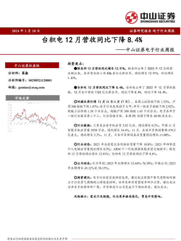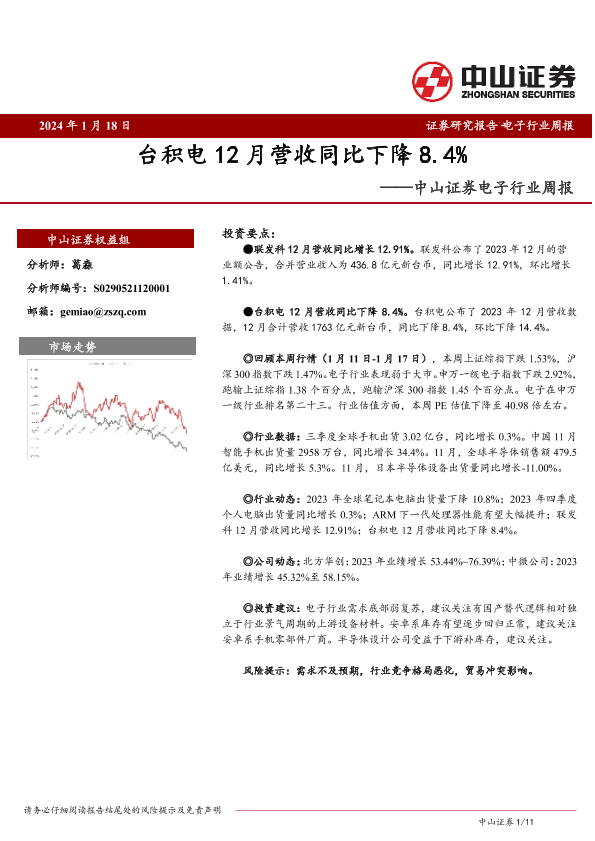 【中山证券】【20240118】20240118-中山证券-电子行业周报:台积电12月营收同比下降8.4%-11页