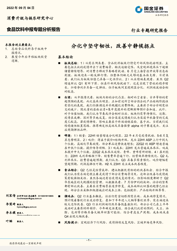 【国金证券】【20220904】食品饮料行业中报专题分析报告:分化中坚守韧性,改善中静候拐点-28页