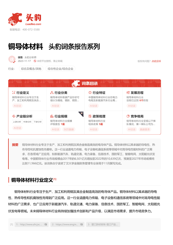 【头豹研究院】【20231117】20240123-头豹研究院-铜导体材料 头豹词条报告系列-22页