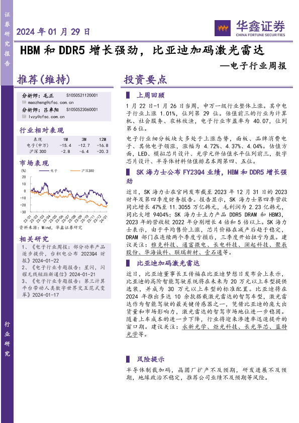 【华鑫证券】【20240129】20240129-华鑫证券-电子行业周报:HBM和DDR5增长强劲,比亚迪加码激光雷达-42页