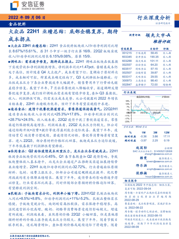 【安信证券】【20220906】食品饮料行业深度分析:大众品22H1业绩总结,底部企稳复苏,期待成本拐点-30页