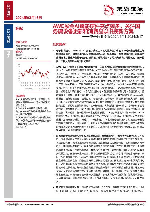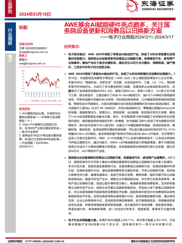 【东海证券】【20240318】AWE展会AI赋能硬件亮点颇多,关注国务院设备更新和消费品以旧换新方案-15页