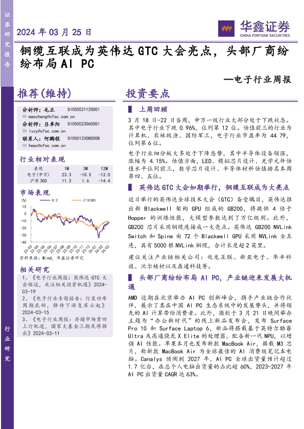 【华鑫证券】【20240325】20240325-华鑫证券-电子行业周报:铜缆互联成为英伟达GTC大会亮点,头部厂商纷纷布局AIPC-39页