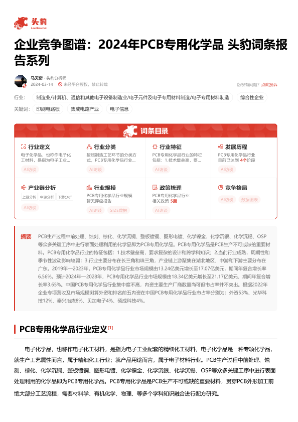 【头豹研究院】【202403】企业竞争图谱:2024年PCB专用化学品 头豹词条报告系列-20页