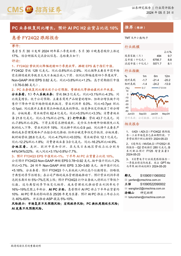 【海通证券】【20240531】20240531-招商证券-电子:惠普FY24Q2跟踪报告-PC业务恢复同比增长,预计AI PC H2出货占比达10%-13页