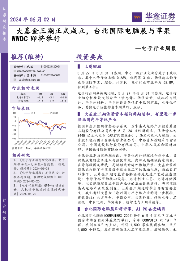 【华鑫证券】【20240602】20240602-华鑫证券-电子行业周报:大基金三期正式成立,台北国际电脑展与苹果WWDC即将举行-38页