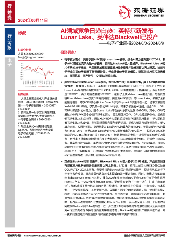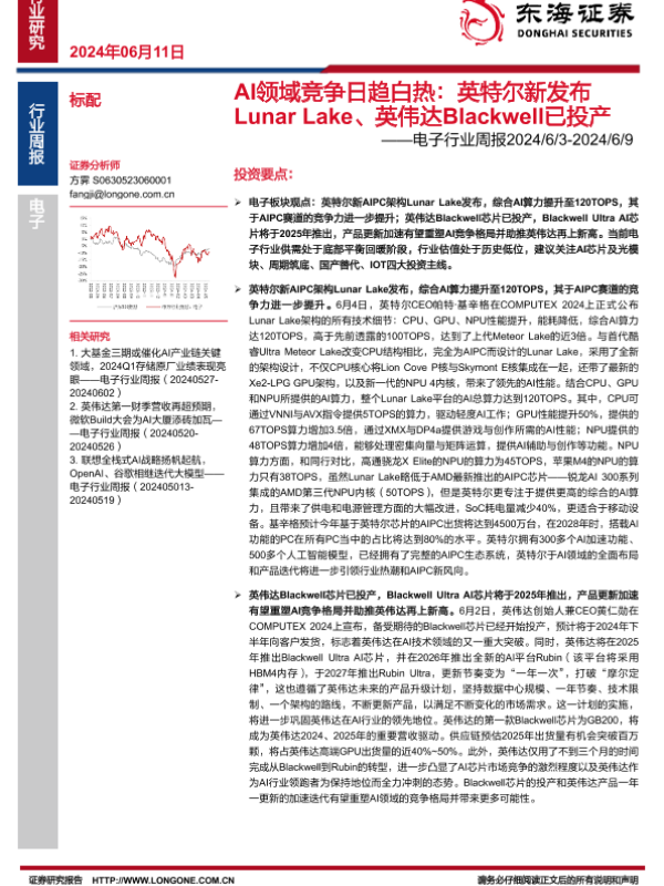 【东海证券】【20240611】AI领域竞争日趋白热:英特尔新发布Lunar Lake、英伟达Blackwell已投产-14页