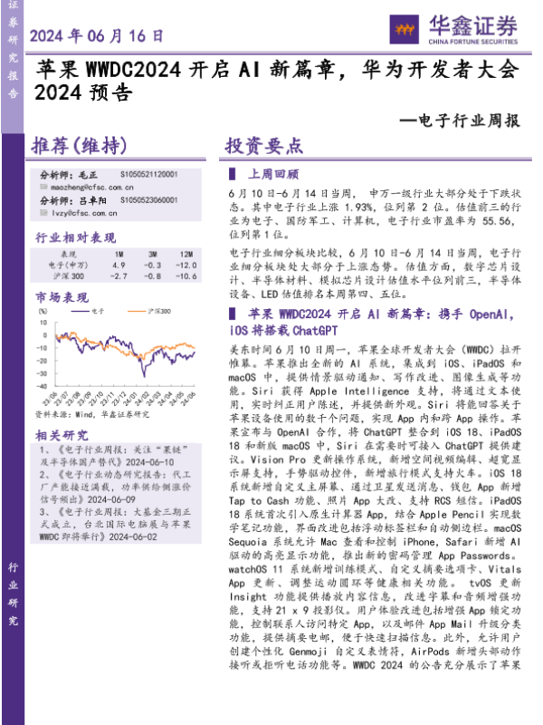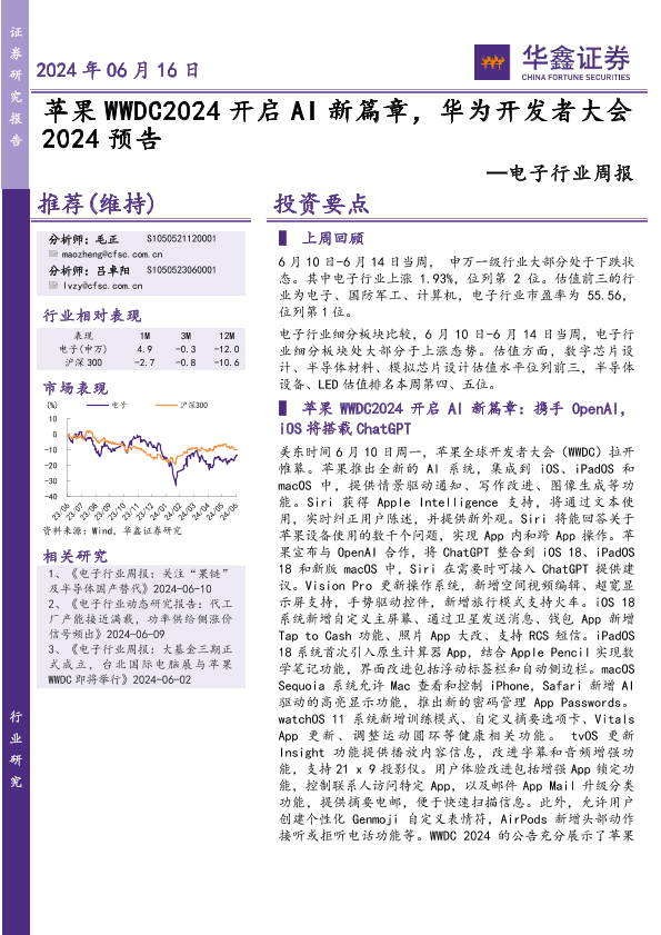 【华鑫证券】【20240616】20240616-华鑫证券-电子行业周报:苹果WWDC2024开启AI新篇章,华为开发者大会2024预告-40页